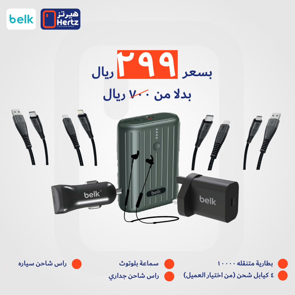 بكج (10 منتجات بيلك) سماعة بلوتوث + بطارية متنقلة 10 ألف + 4 كيابل شحن + راس شاحن منزلي + راس شاحن سيارة