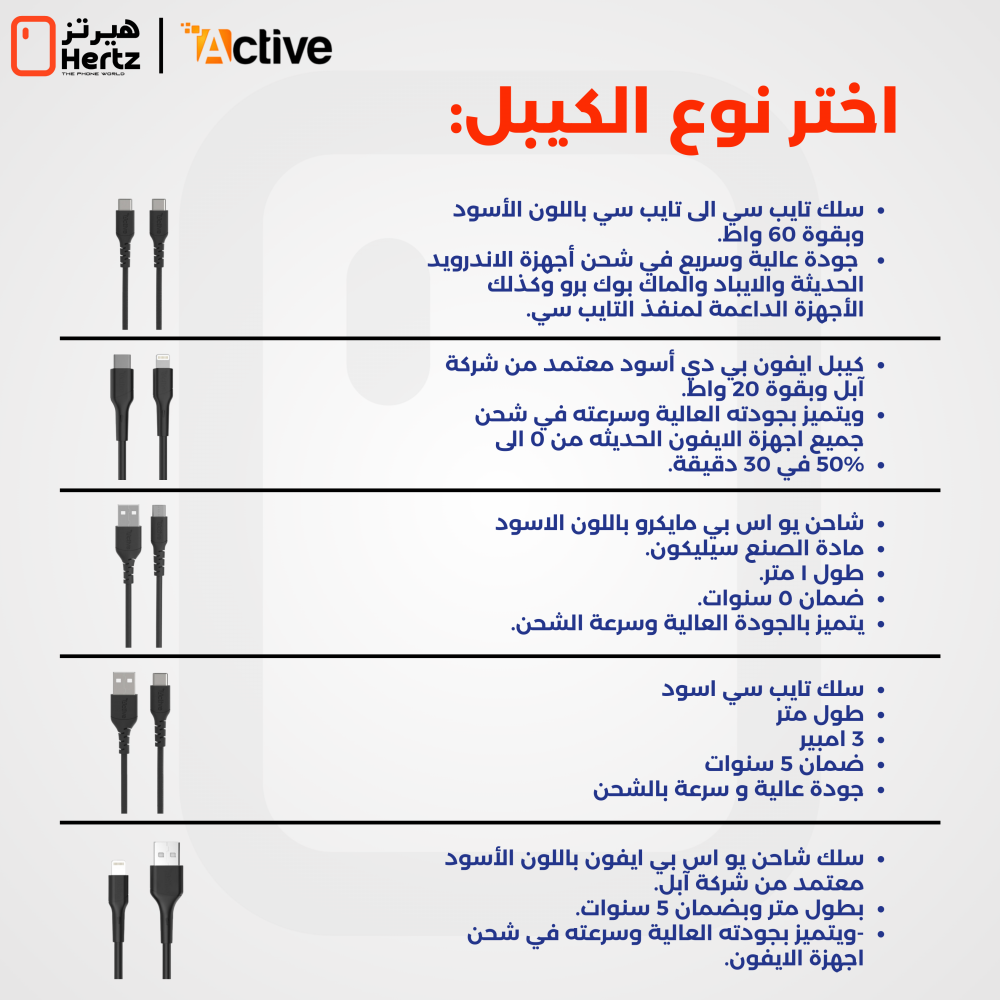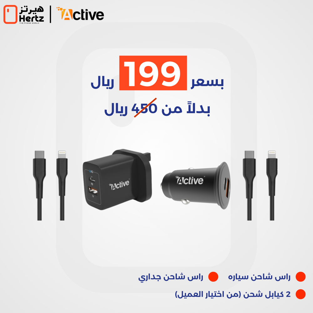 بكج (4 منتجات اكتف) 2 كيبل شحن + راس شاحن سيارة + راس شاحن جداري